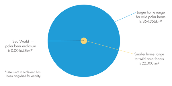 The Polar Bear Shores enclosure gives polar bears a fraction of the space they use in the wild. The Polar Bear Shores enclosure is 0.001658km². Yet wild polar bears use ranges spanning tens to hundreds of thousands of square kilometres. Research also shows that wide-ranging species like polar bears can experience poorer welfare when confined to restricted, simplified spaces.